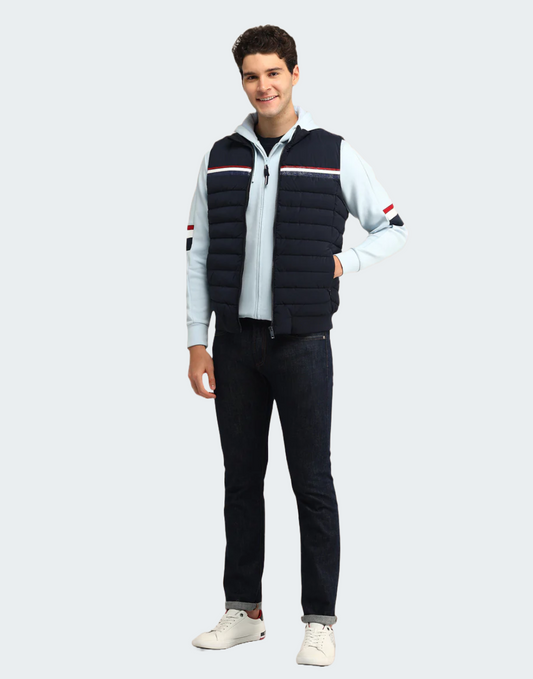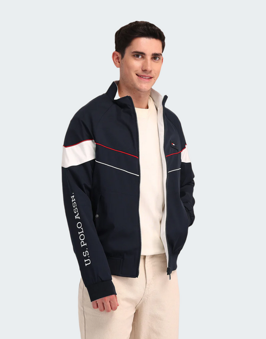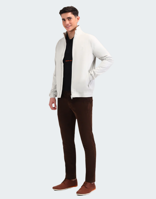 White & Navy Stand Neck Solid Jacket