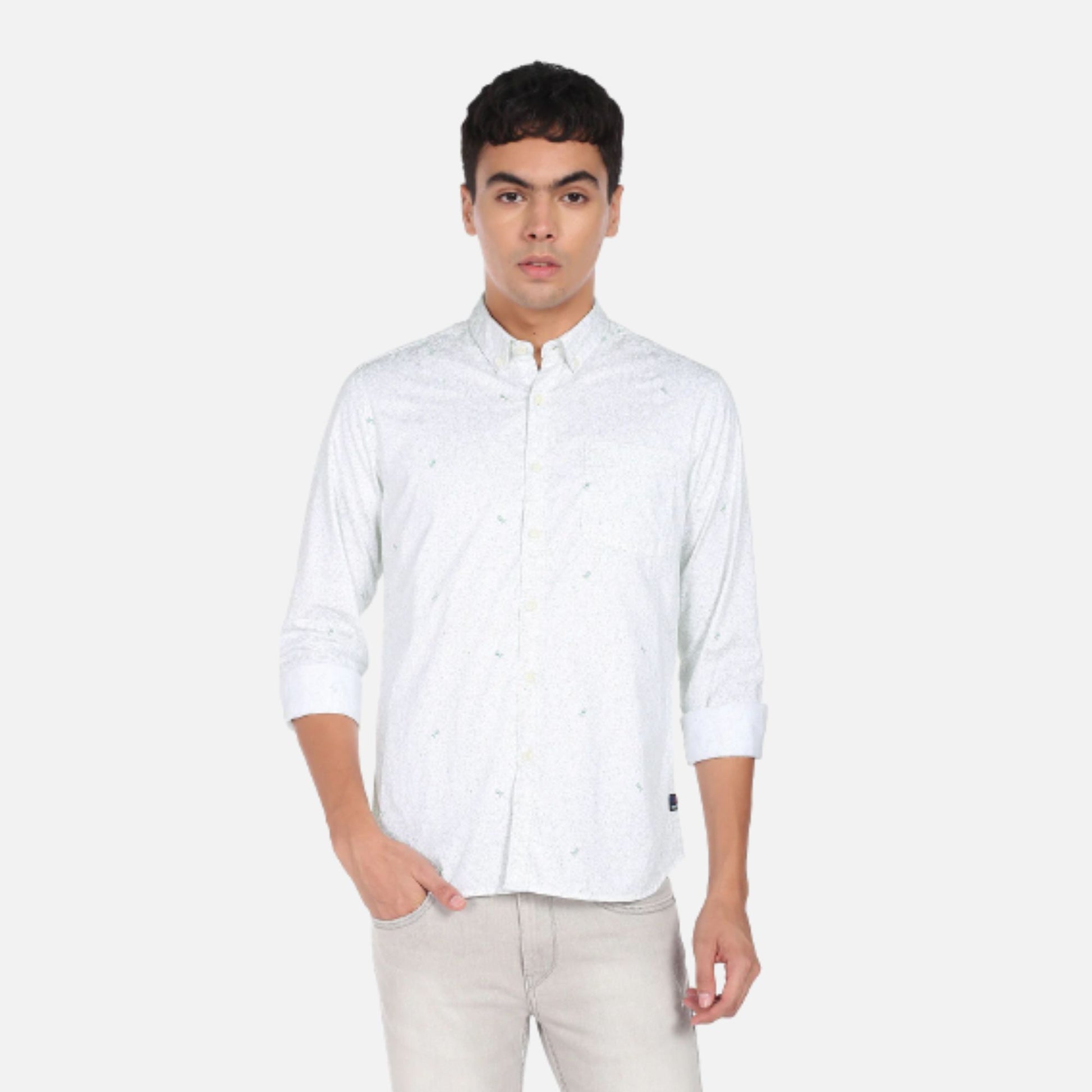 Add to your distinguished style with this shirt from Flying Machine. It is designed with a neat button-down collar and made from cotton fabric that keeps you warm during winter and cool during summer. Style it with a pair of faded jeans and sneakers for a perfect weekend.