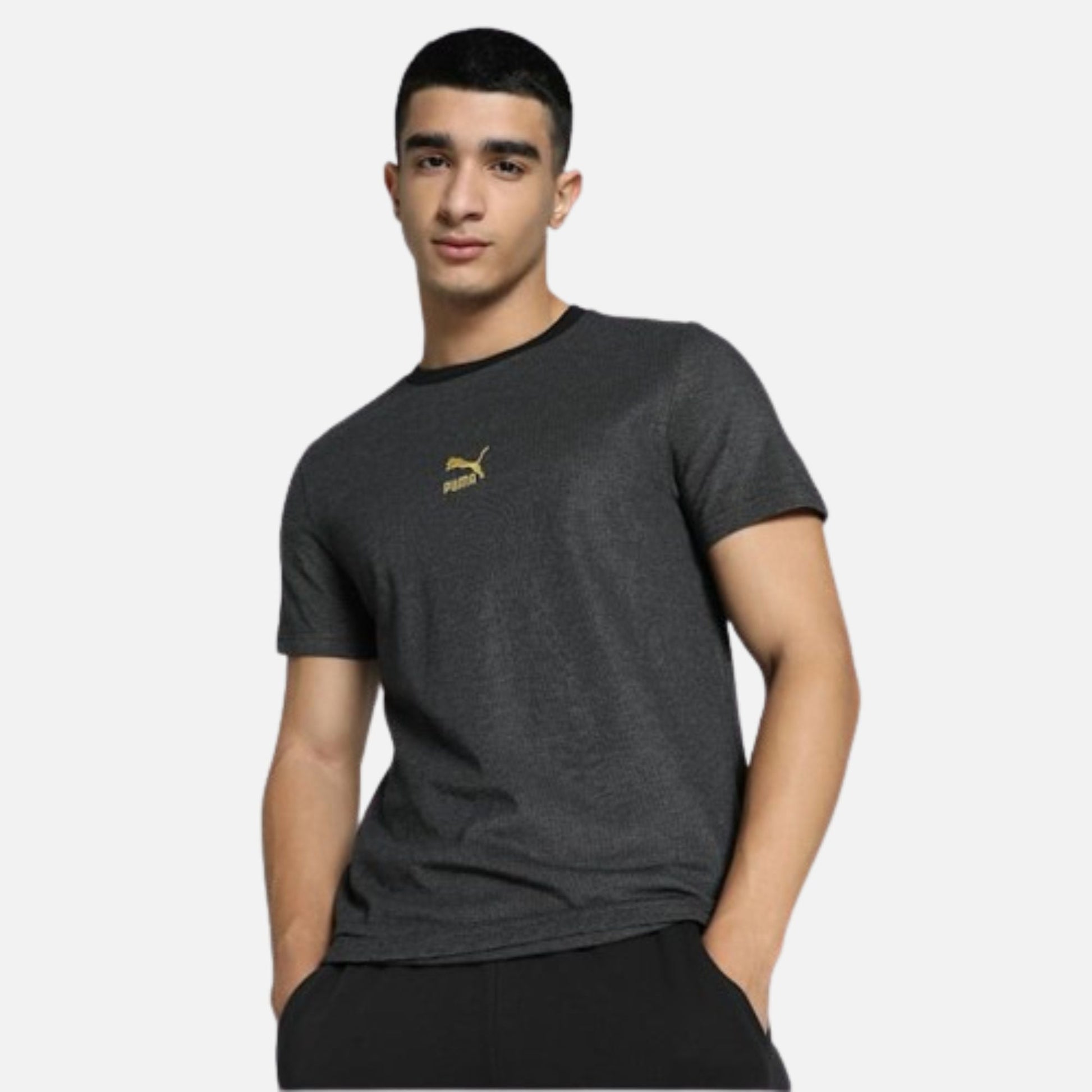 The Classics Men's Pique Slim Fit T-shirt boasts a sleek design with a ribbed design and embroidered PUMA cat logo on the front. This versatile tee is perfect for any workout or casual occasion. Made with lightweight and breathable fabric, it ensures comfort throughout the day.