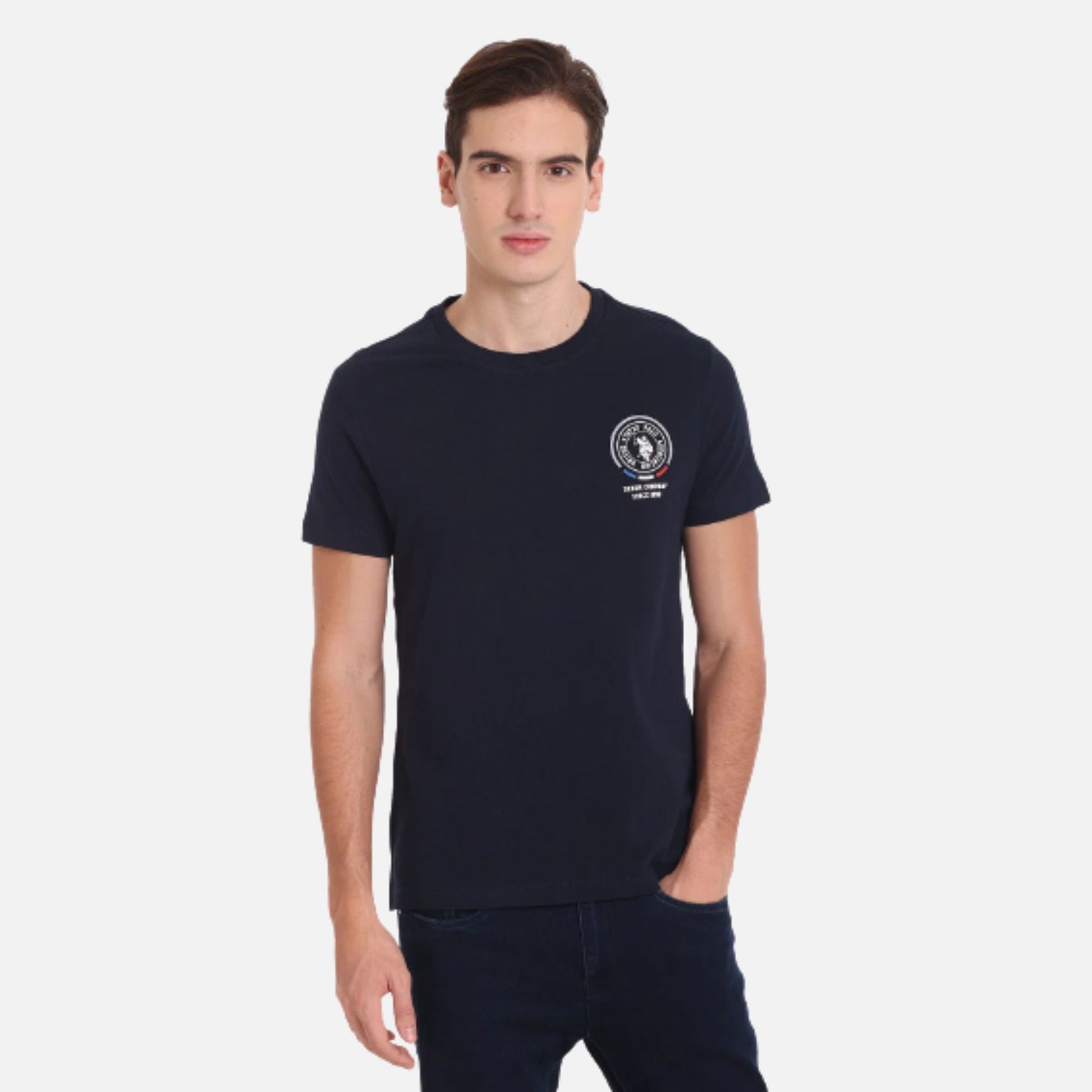 Sport the trendiest attire with this t-shirt that comes with a crew neck, an impeccable finish, minimal details, and a brand logo on the front.