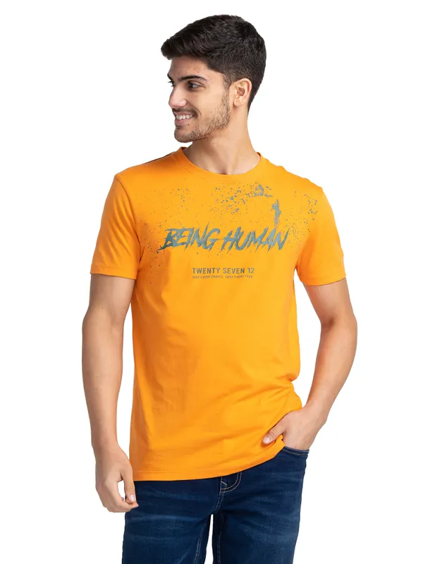 Leave The Competition Behind With This Yellow Short Sleeve T-Shirt. Featuring A Crew Neck And A Signature 'Being Human' Graphic, This Pure Cotton Tee Is Going To Make You Feel Like A Superstar.