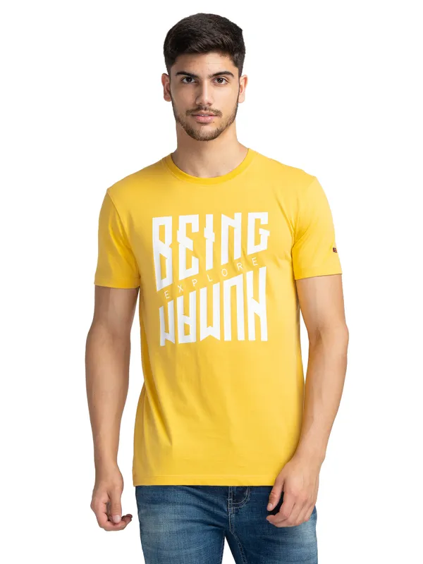 Give Others A Reason To Smile When You Walk Out In This Sunshine Yellow Printed T-Shirt. The Crew Neck Design And Short Sleeve Silhouette Ensure This Tee Can Be Worn Every Day. It Is Made From 100% Cotton And Comes With Being Human's Signature Branding.